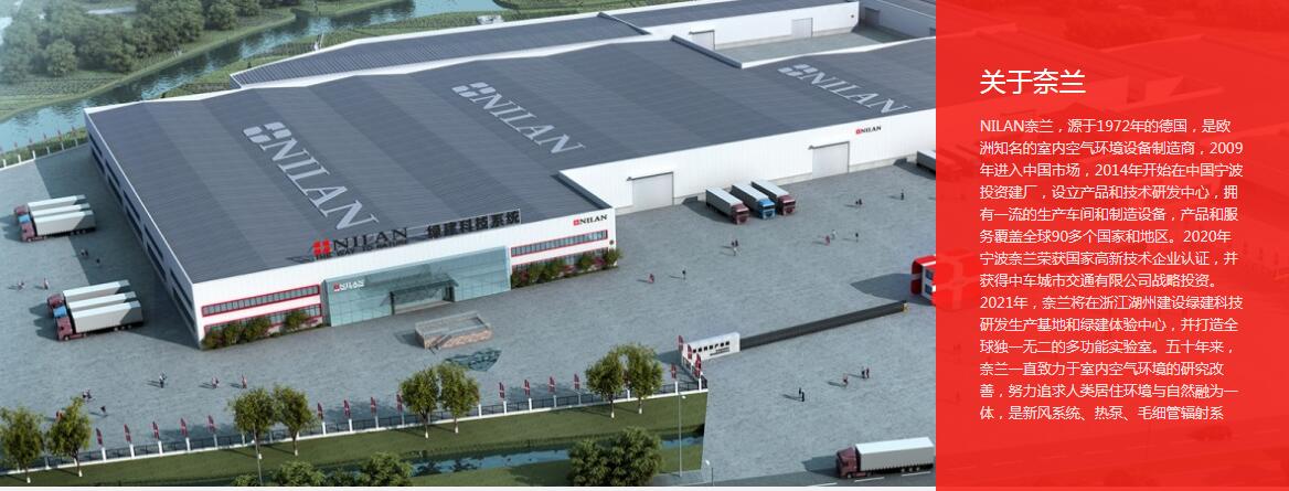 寧波奈蘭環(huán)境系統(tǒng)有限公司(NILAN)源于1972年的德國,是歐洲知名的室內(nèi)空氣環(huán)境設(shè)備制造商,2009年進(jìn)入中國市場,2014年開始在中國寧波投資建廠,設(shè)立產(chǎn)品和技術(shù)研發(fā)中心,擁有一流的生產(chǎn)車間和制造設(shè)備,產(chǎn)品和服務(wù)覆蓋全球90多個國家和地區(qū)。2020年寧波奈蘭榮獲國家高新技術(shù)企業(yè)認(rèn)證,并獲得中車城市交通有限公司戰(zhàn)略投資。2021年,奈蘭將在浙江湖州建設(shè)綠建科技研發(fā)生產(chǎn)基地和綠建體驗中心,并打造全球獨一無二的多功能實驗室。五十年來,奈蘭一直致力于室內(nèi)空氣環(huán)境的研究改善,努力追求人類居住環(huán)境與自然融為一體,是新風(fēng)系統(tǒng)、熱泵、毛細(xì)管輻射系統(tǒng)、被動房配套技術(shù)等產(chǎn)品服務(wù)的優(yōu)質(zhì)品牌廠家,同時在健康綠色住宅領(lǐng)域有著深厚沉淀,奈蘭健康住宅七度空間一體化解決方案,即“THONFIE”毛細(xì)七恒系統(tǒng),在國內(nèi)外民、商、政等各領(lǐng)域有著豐富的項目案例應(yīng)用實踐經(jīng)驗,深受行業(yè)認(rèn)可和用戶喜愛——奈蘭,讓家融于自然!